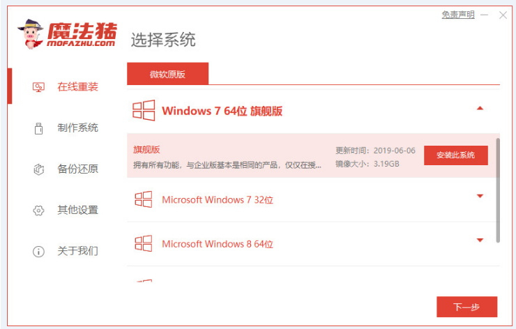 1、外星人电脑怎么重装系统呢?首先去官网上下载并安装魔法猪装机工具,好了之后点击打开,选择我们需要重装的win7系统,点击下一步。
