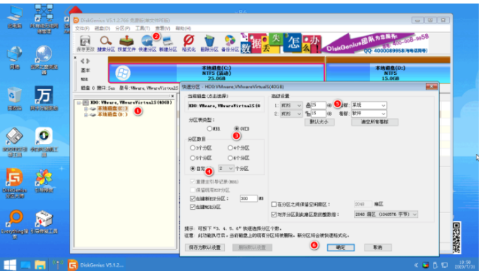 3.进入pe系统,点击桌面DiskGenius分区工具即可对硬盘快速分区,注意硬盘分区有两种,假设使用的电脑没安装过win7系统,那安装win10系统要选择GUID类型。(注意假如是全盘分区,先全盘删除磁盘分区再进行重新分区,此时分区中会格式化硬盘,导致文件丢失,有重要文件的可以提前移走到别的U盘上储存。)