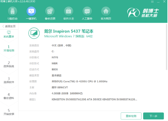 2、然后会进行环境检测,显示电脑配置。检测环境完成后,点击“下一步”。