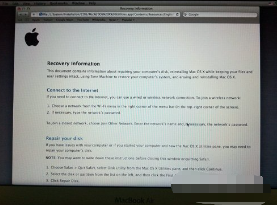 1、首先在 MacBook Air 关上的情况下,按着 Command 及 R 两个按键不放手,然后同时按下最右上角的开关键一下(记着此时仍然继续按着 Command + R 键)。
