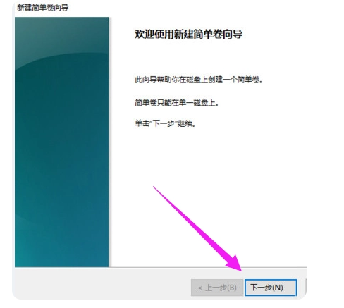 8、在这个界面中,为新建的简单卷选择磁盘的格式,一般默认选择“NTFS”即可,继续“下一步”。