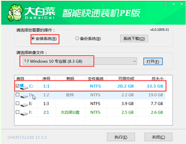 5、打开大白菜一键装机软件,选择“安装系统”,“映像文件”选择已下载的win10镜像系统,安装在“C盘”并点击“执行”进入下一步。