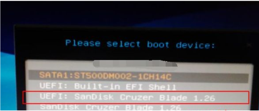 3、重启后不停按F12或F11或Esc等启动快捷键,调出启动菜单对话框。选择识别到的U盘选项,一般是U盘名称或者带有USB字样的,比如SanDisk,如果要uefi模式下安装,选择带UEFI模式的项,按回车键进入。