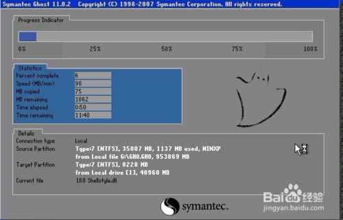 此时会进入一个重装选项的界面,如果启动盘中已经有GHO文件,可以选择第一个选项,回车,系统会进入自动重装的过程,结束后重启即是一个新的系统。(如图进度条结束,即可)