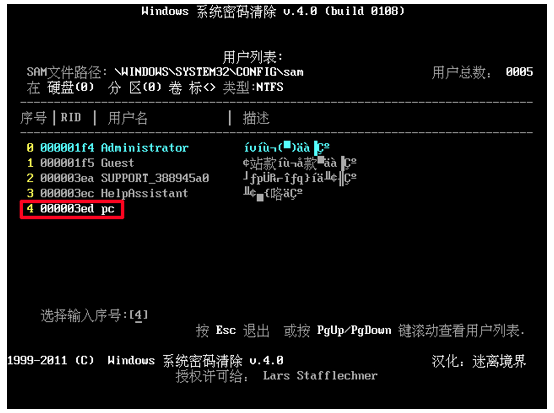 此时我们在上图可以看到工具已经搜索到sam文件,我们按下Enter键继续下一步的操作,接着我们就会看到这个文件里所保存下来的系统账户信息,下面红色方框所选就是小编的电脑自己创建的一个名为pc的系统账户;如下图所示: