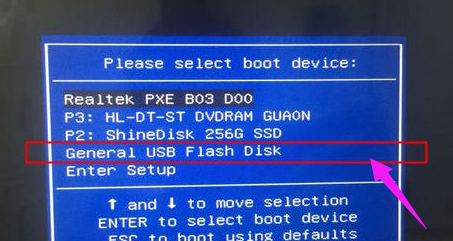 在需要破解开机密码的xp电脑上插入pe启动盘,启动电脑后不停按F12、F11、Esc等快捷键,在弹出的启动菜单选择框中选择识别到的usb启动项,比如General USB Flash Disk,按回车进入