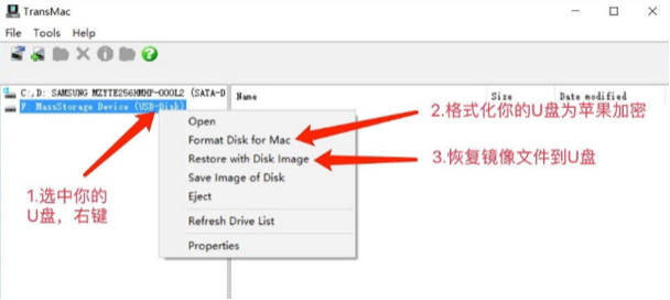 (1)U盘插入电脑,打开TransMac。右击U盘。选择Format Disk for Mac选项格式化U盘