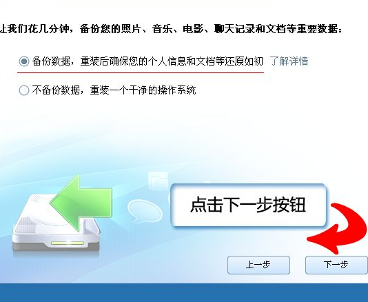 3、点击立即开始选项,此时会提示你是否备份数据,选择然后下一步。