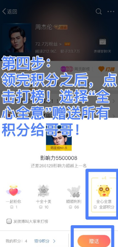 4、最后等我们一天所有可以活得的积分都获得的时候就可以到打榜界面选择全心全意这个礼物,将自己所有的超话积分都送给周杰伦了!