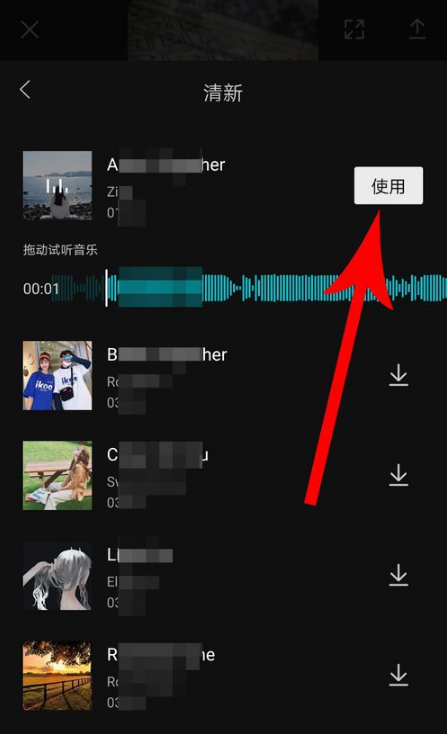 歌曲下载完毕后点击“使用”,这时剪映会重新打开视频剪辑界面,注意查看,音频歌曲添加到了视频轨道下方,位置见下图