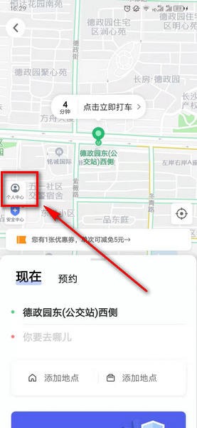 2、进入打车的界面之后点击左侧的个人中心,如下图所示;