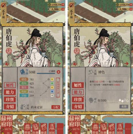 最重磅的人物当属这位名传千古的风流才子。首先说技能,有些提前知道的玩家认为这位公子的技能有点鸡肋,因为给的钱忒少,并且许多工作普遍需求人数没有10+。但是我们的眼光需要结合整体来看,首先唐伯虎在天级人物中拥有两个特级KPI(并且个人认为是需求量最大的两个)而且在理财方面的(极)KPI不输候级,当他配上合适的宝物时,这位公子看似风流的立绘实则恐怖的生产效率才会显露峥嵘。十铜币看似较少但是城市建设属于长线,当你建筑积累建设多了,给予你的铜钱也会默默的积累在你的钱库中,只是难以察觉罢了。
