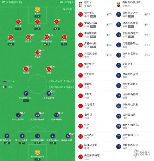 未上场替补:1-帕斯维尔、13-拜洛、3-德利赫特、6-德弗赖、7-贝尔温、9-吕克-德容、12-诺阿-朗、16-马拉西亚、25-哈维-西蒙斯、26-弗林蓬