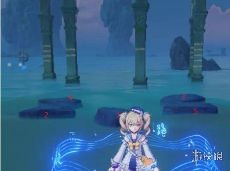 调整完水位后,来到宝箱位置,可以看出,每个柱子都对应一块石头,按照柱子的横杠可以得到相应顺序,按顺序踩石头,解密完成。