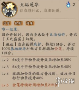 Lv.5 施加的金莲提前移除时,解除自身控制效果,免消耗施放1次【刹那莲华绽放】,该次伤害不触发敌方全体的御魂及被动,但伤害降低40%。