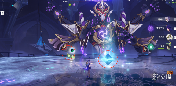 boss第三阶段,还是捡棱晶块,小飞猪会自动攻击消耗boss的护盾值,小飞猪能量满了,角色可以使用类似草神的e技能,可以大量消耗boss的血量!