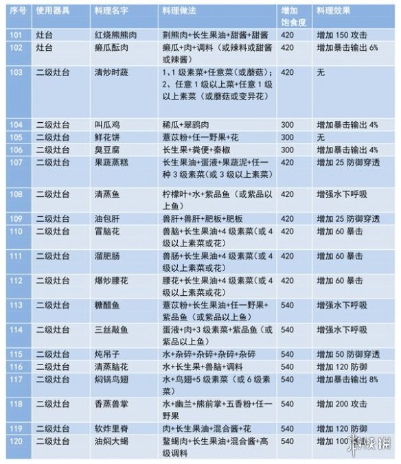 3.小兽肉2个=小块烤肉/烤兔肉/烤蛙腿随机出