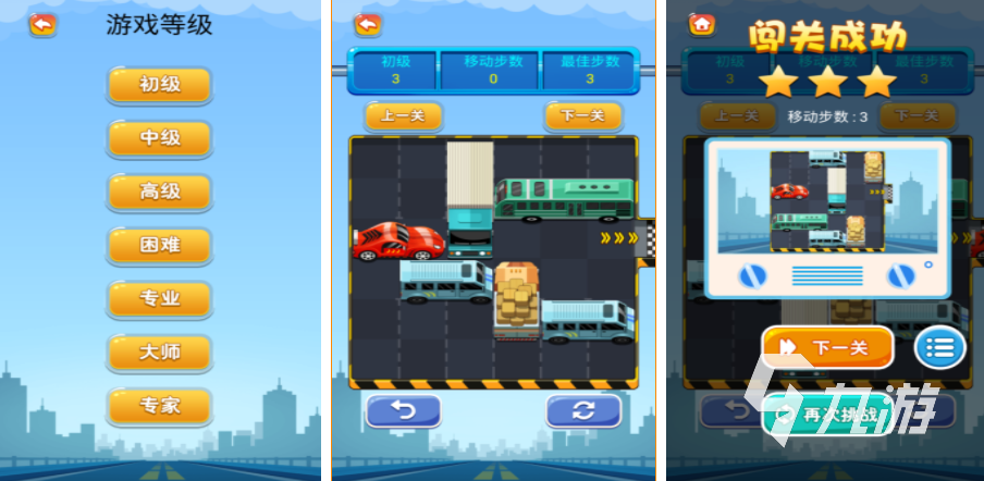这是一个画面设置非常独特的华容道游戏,画面上使用的不再是传统的设计,而是由各种不同长度,外观的车辆组成的关卡,玩家需要做的就是移动其他车辆,让红色的跑车可以顺利的离开停车场,为了适应更多的人群,游戏中分成七个不同的难度,在每一个关卡中都会有对应的步数要求,玩家只有在规定的步数内才能获得更高的星级,感兴趣的都可以来游戏中挑战一下自己。
