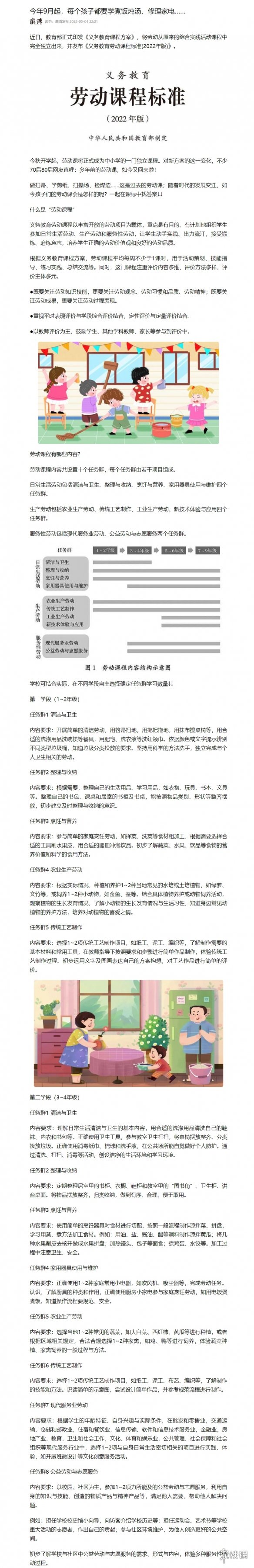 近日,教育部正式印发《义务教育课程方案》,将劳动从原来的综合实践活动课程中完全独立出来,并发布《义务教育劳动课程标准(2022年版)》。今秋开学起,劳动课将正式成为中小学的一门独立课程。
