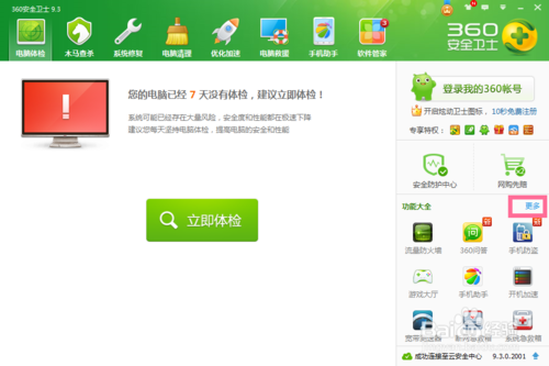 首先你需要打开360安全卫士然后点击右侧功能大全里的《更多》。