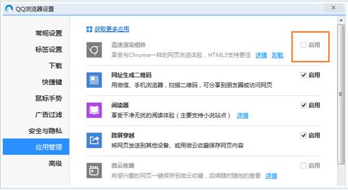 2、在QQ浏览器设置-【应用管理】,点击【高速渲染组件】的安装,安装完成后会自动启用