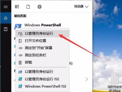 在搜索结果中右键点击Windows Powershell菜单项,在弹出菜单中选择“以管理员身份运行”菜单项。