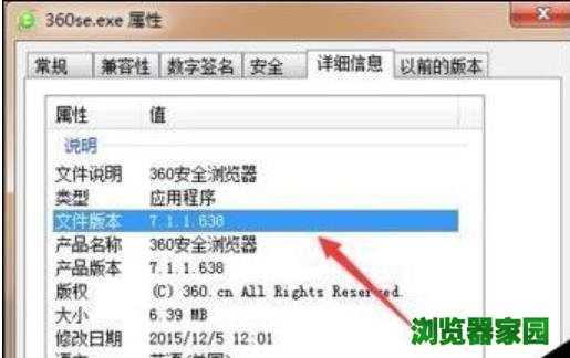 4、切换到“详细信息”选项卡,在“文件版本”中就可以看到目前使用的360浏览器的版本信息了。
