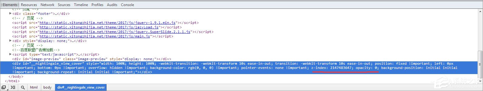8、好奇的童鞋们肯定想知道这是怎么实现的吧。按【F12】,在【Element】栏我们翻到body节点结尾的地方,可以看到多了个id为__nightingale_view_cover的div节点。这个节点设置成宽高100%,黑色半透明,显示在最前端(z-index)。简单说就是个半透明的遮罩。