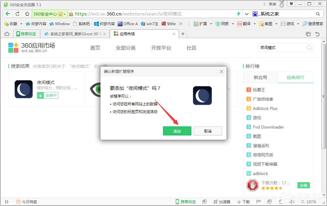 3、在打开的应用市场中,搜索“夜间模式”,找到两款插件,我们选择第一款,安装。