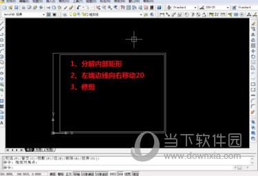 4、分解内部小矩形,并向右移动分解之后的小矩形左边线20mm,然后修剪多出的线段。