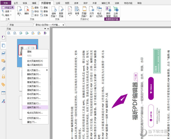 3、点击“页面管理-旋转页面给”或者点击左边的“页面缩率图”,鼠标右键需要处理的功页面,选择“旋转页面”;