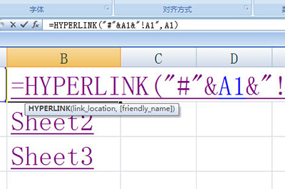 接着在旁边输入一个函数=HYPERLINK("#"&A1&"!A1",A1)