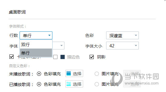 4、用户可以在这里设置歌词的行数,能够设置单行或者双行,还可以设置桌面歌词的字体和字体大小,颜色和阴影等设置都任你选择,根据用户自己的喜好进行调整,如下图所示: