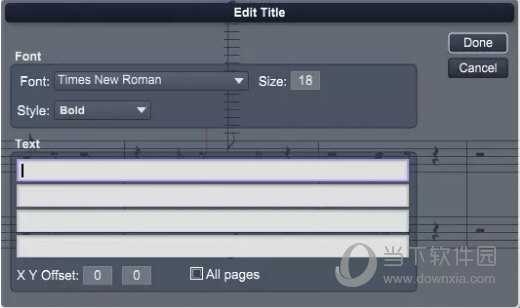 打开Overture 钢琴打谱软件,在第一个页面上双击标题、作曲者、版权等条目,即可打开对话框。