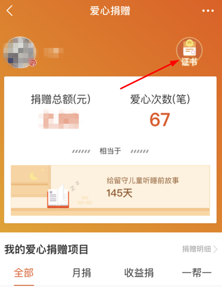 4.最后只需要在列表中,点击捐赠记录就可以看到证书。