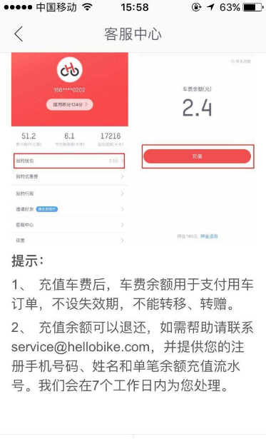 退车费(充值余额):发邮件给service@hellobike.com 附上注册手机号码、姓名以及单笔余额充值流水号