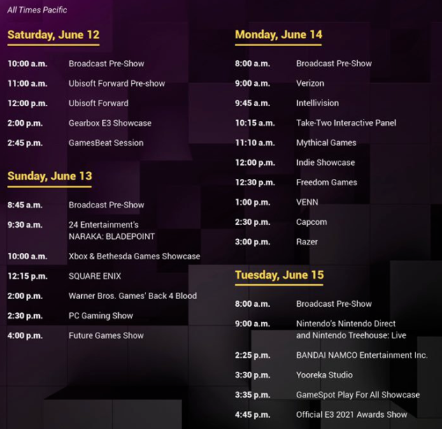 2021年E3展会将于6月12日举行,由于疫情的原因,本次展会依旧会采用线上发布会的形式。今日(6月9日)官方推特更新了完整日程表,本届E3将从6月12日持续至6月16日,在前一天还有一场夏日游戏节作为预热,届时将有30多款游戏公布。