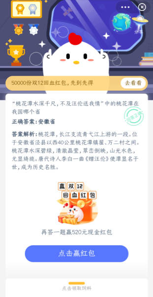 以上就是西西小编为大家带来的桃花潭水深千尺不及汪伦送我情中的桃花潭在我国哪个省,蚂蚁庄园今日答案。希望大家喜欢。
