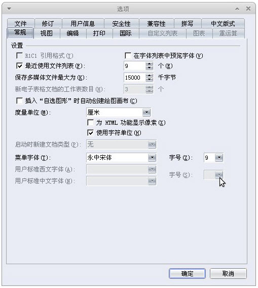 然后打开永中Office – > 文件 – > 选项 – > 常规 – > 菜单字体 ,选择永中宋体: