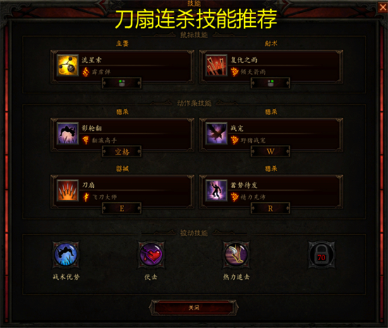 5、这个时候可以继续杀boss做一些悬赏,也可以选取怪物密度大的场景去连杀,个人比较推荐先民神殿,一来是怪物密度极高而且基本上没有回头路,二来是大概率会刷出诅咒宝箱事件,增加装备和经验的获取,如果恰巧碰到悬赏任务就一并把它做了。以下配图仅供参考,可以根据个人习惯和装备进行调整。该图众多狭长的地形也有利于怪物自行聚集,飞刀连杀在看准怪物聚集的方向释放即可,刀扇可以在更广阔的地方四周引怪,两者都要注意引怪和杀怪的节奏不要把技能释放的过于频繁,飞刀前期秒怪很难触发回憎特效而且影响范围有限所以容易憎恨吃紧,刀扇则需要时间来累计层数buff。建议带个远程回憎技能,在击杀期间注意有序释放,既可以击中远方怪物维持连杀不断,又可以回能增加次要技能的释放频率。