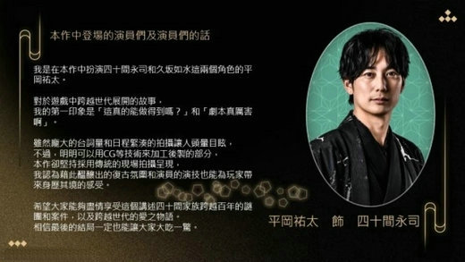 虽然庞大的台词量和日程紧凑的拍摄让人头晕目眩,不过,明明可以用 CG 等技术来加工后制的部分,本作却坚持采用传统的现场拍摄呈现,我认为藉此酝酿出的复古氛围和演员的演技也能为玩家带来身历其境的感受。