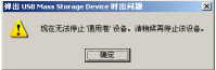 在使用USB数据进入数据传输的时候,可是当数据传输完成之后,选择计算机右下角的卸载USB设备的时候系统却经常会提示现在无法停止 通用卷.请稍候停止该设备。如图1所示相应的系统消息警